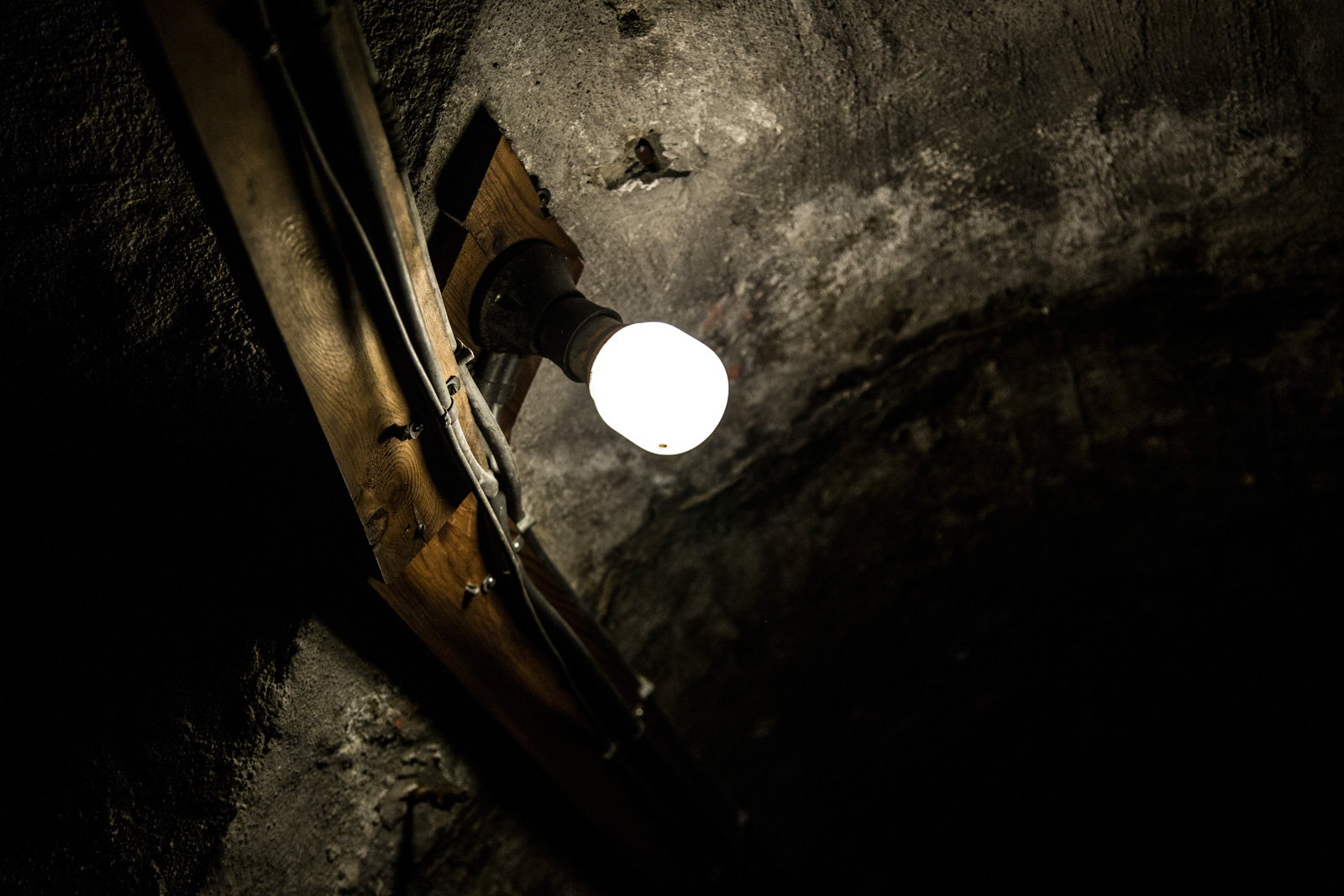 Tunnelen er oplyst af elektriske elpærer, der sidder fast i de afskallede betonvægge. Her lugter let jordslået. Luften er kølig. Trods lidt spindelvæv om de dovne elpærers svage lys, er her forholdsvist rent og pænt, og jeg ser hverken flagermus eller rotter i den dunkle tunnel. Her er cirka to meter fra gulv til loft og en meter mellem tunnelens vægge.